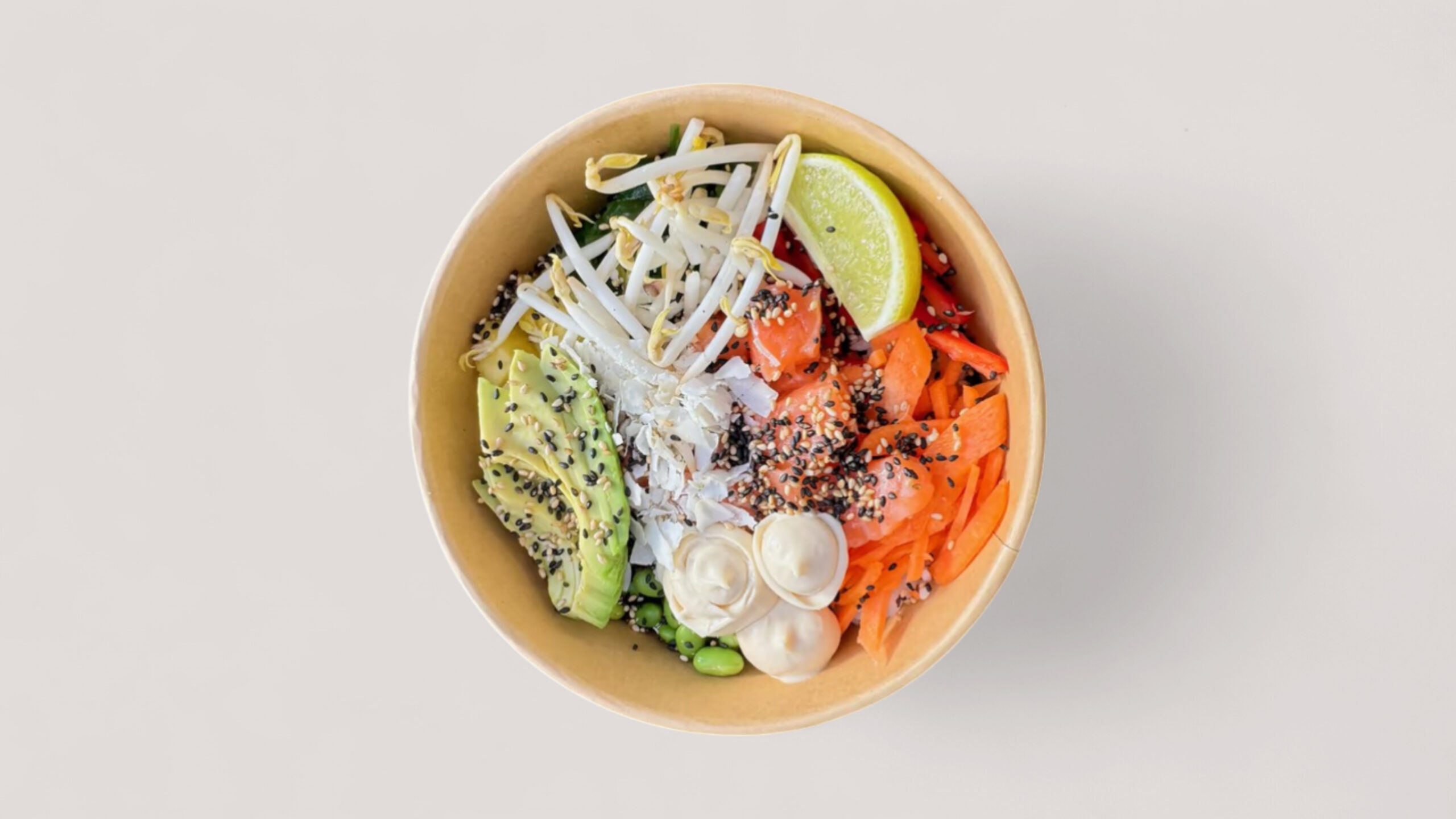friss lazac, kápia, wakame, sárgarépa, edamame, ananász, avokádó, szezámmag, yuzu, japán majonéz, kókuszchips