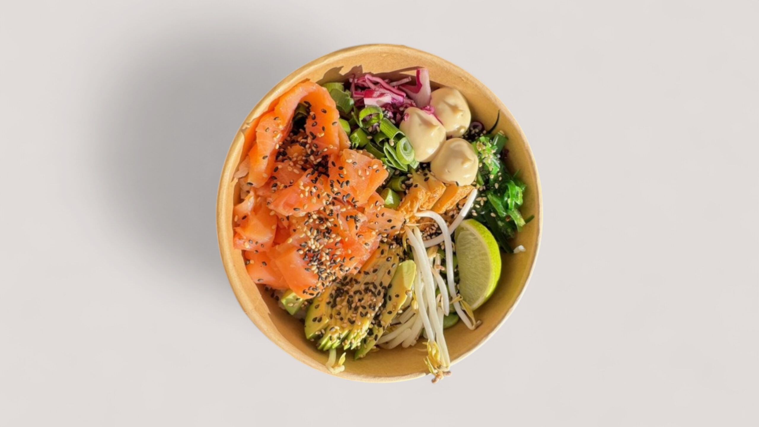 friss lazac, kápia, wakame, sárgarépa, edamame, ananász, avokádó, szezámmag, yuzu, japán majonéz, kókuszchips